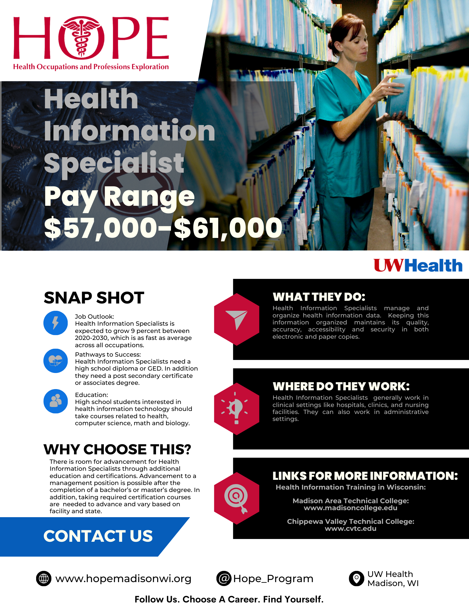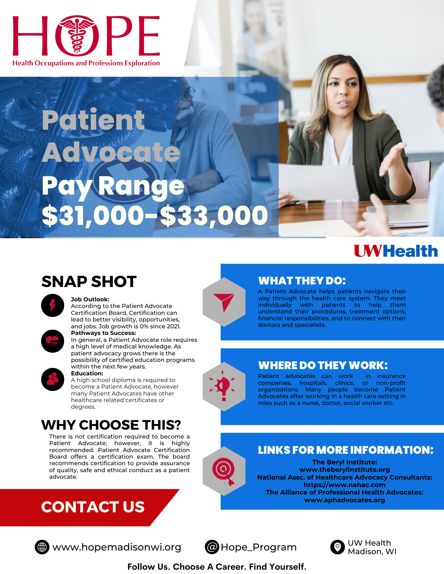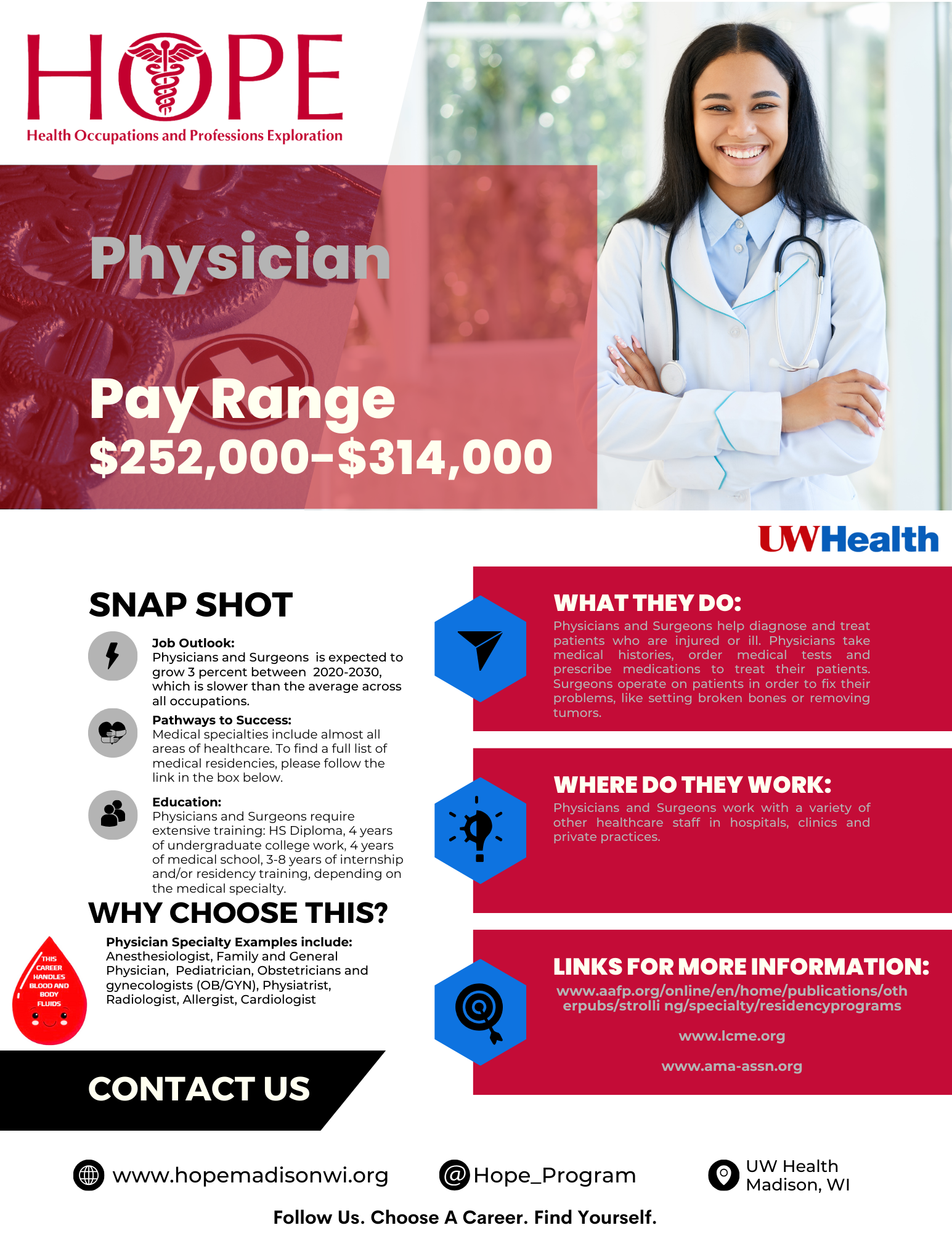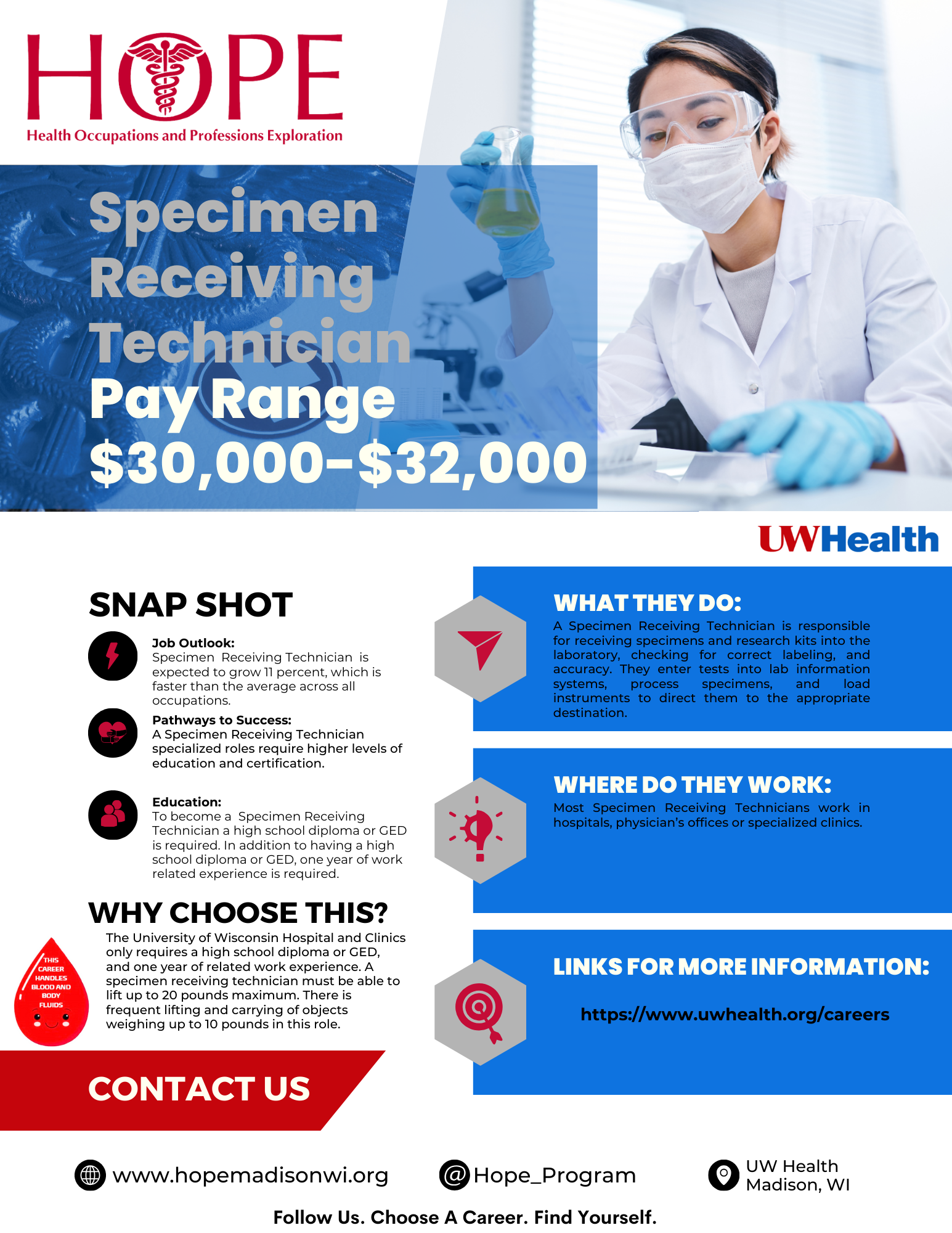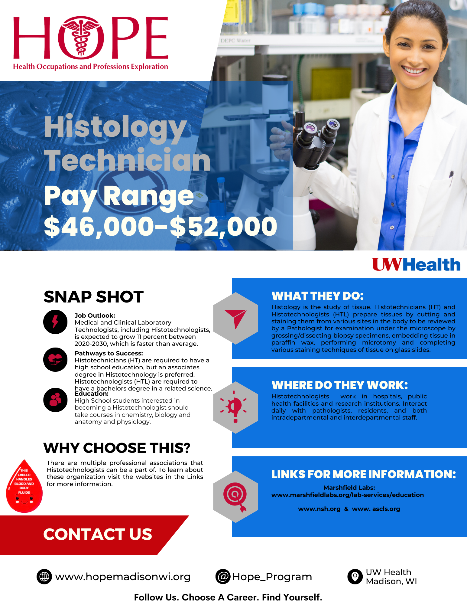 Click and Explore each bubble to explore specific pathways and click the career titles to bring up the over 70 different career “snapshots” in healthcare. This career explorer includes tons of useful information including career descriptions, education requirements, employment outlook percentages, and more!