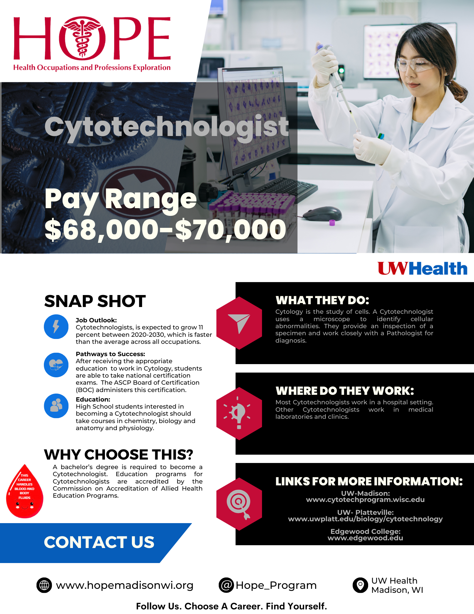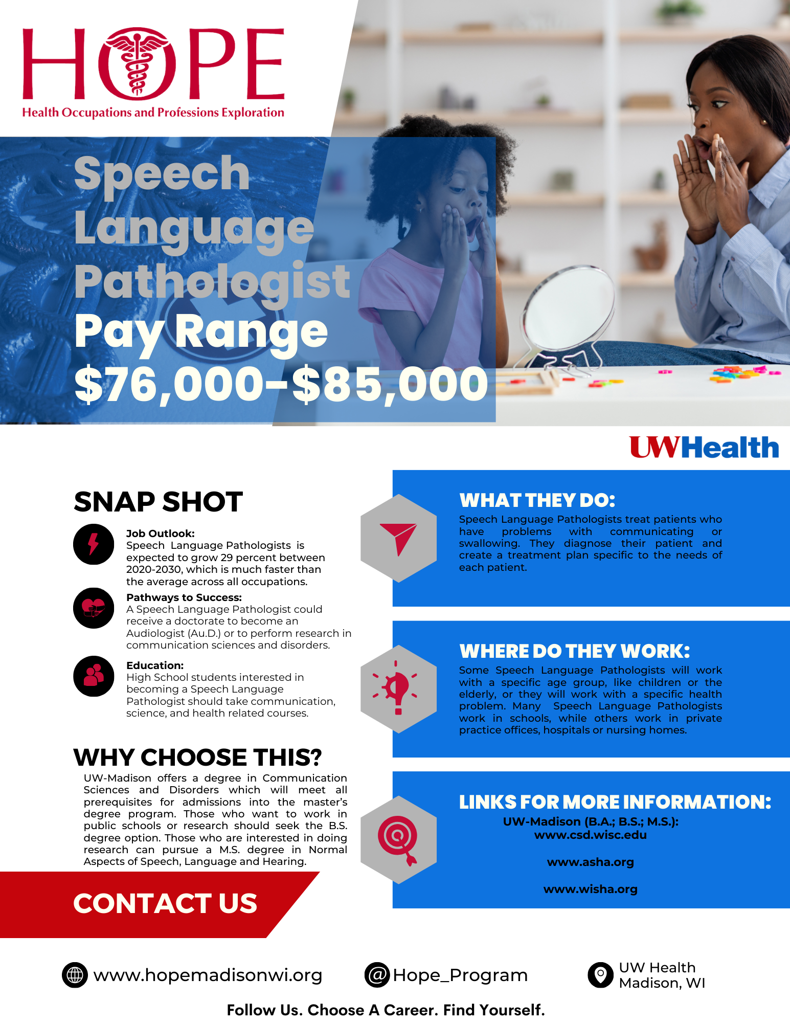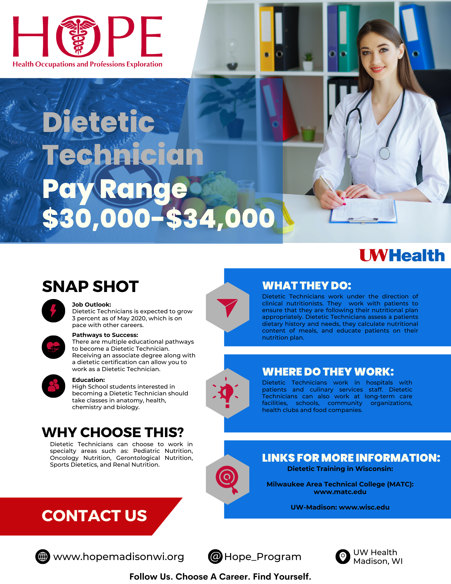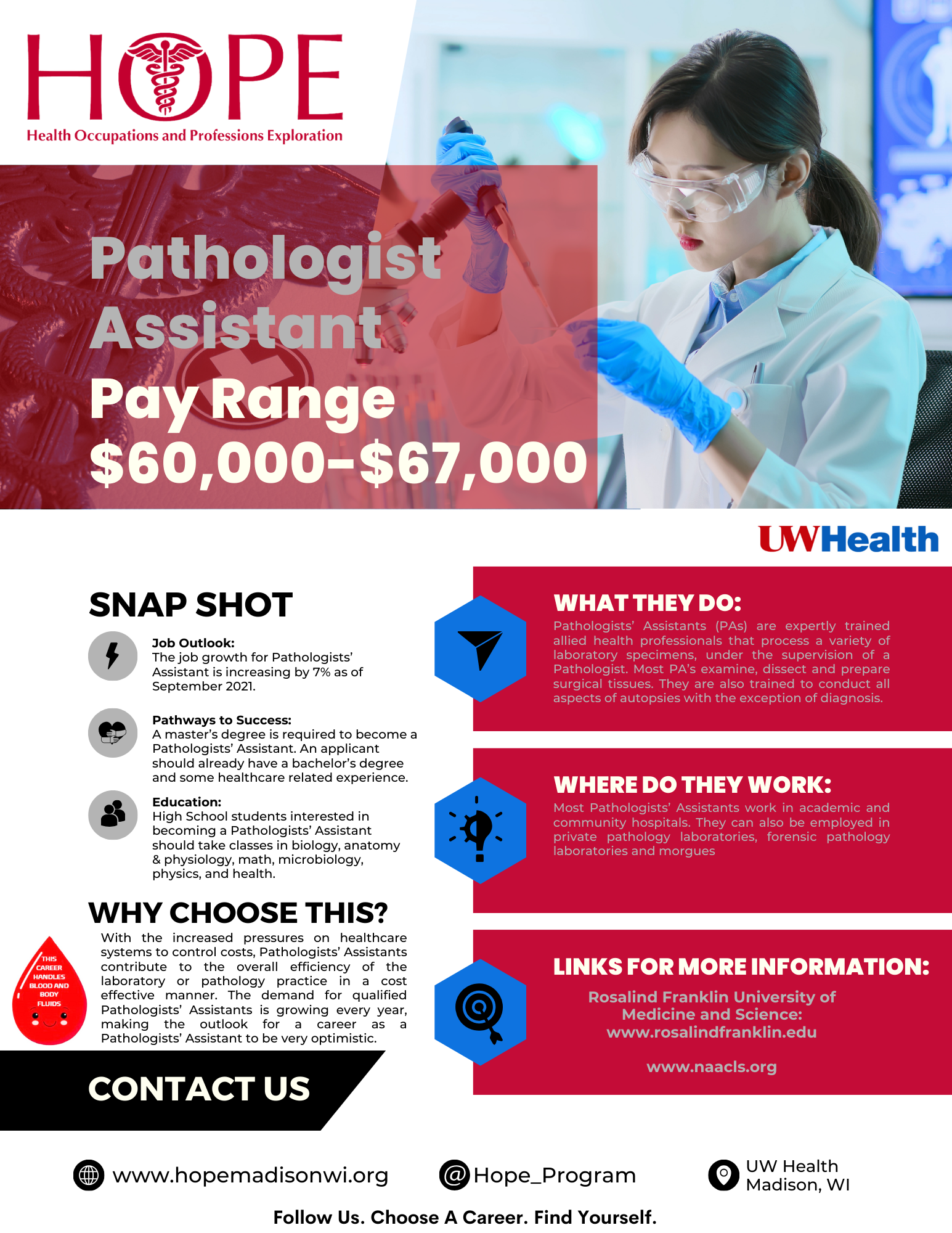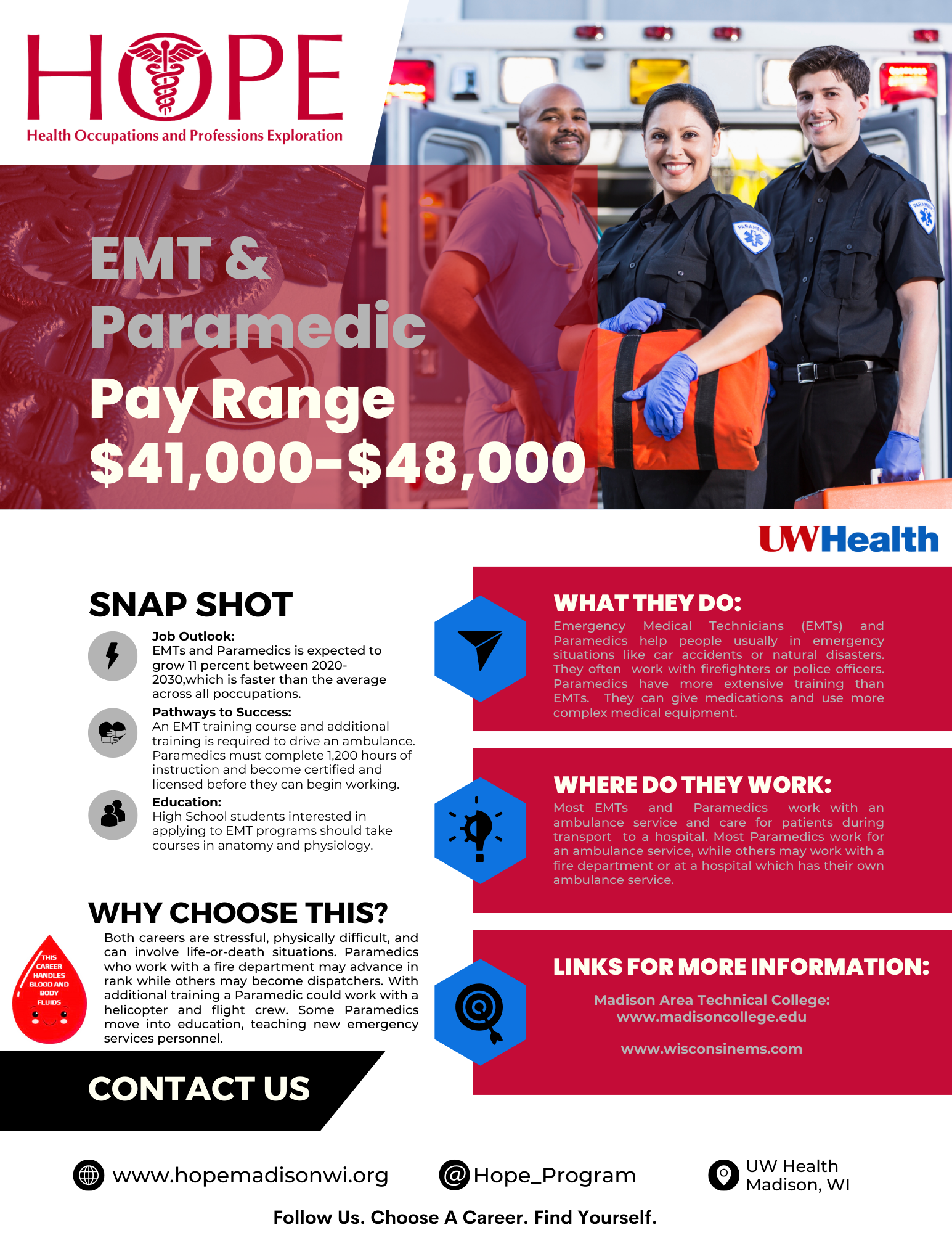 Click and Explore each bubble to explore specific pathways and click the career titles to bring up the over 70 different career “snapshots” in healthcare. This career explorer includes tons of useful information including career descriptions, education requirements, employment outlook percentages, and more!