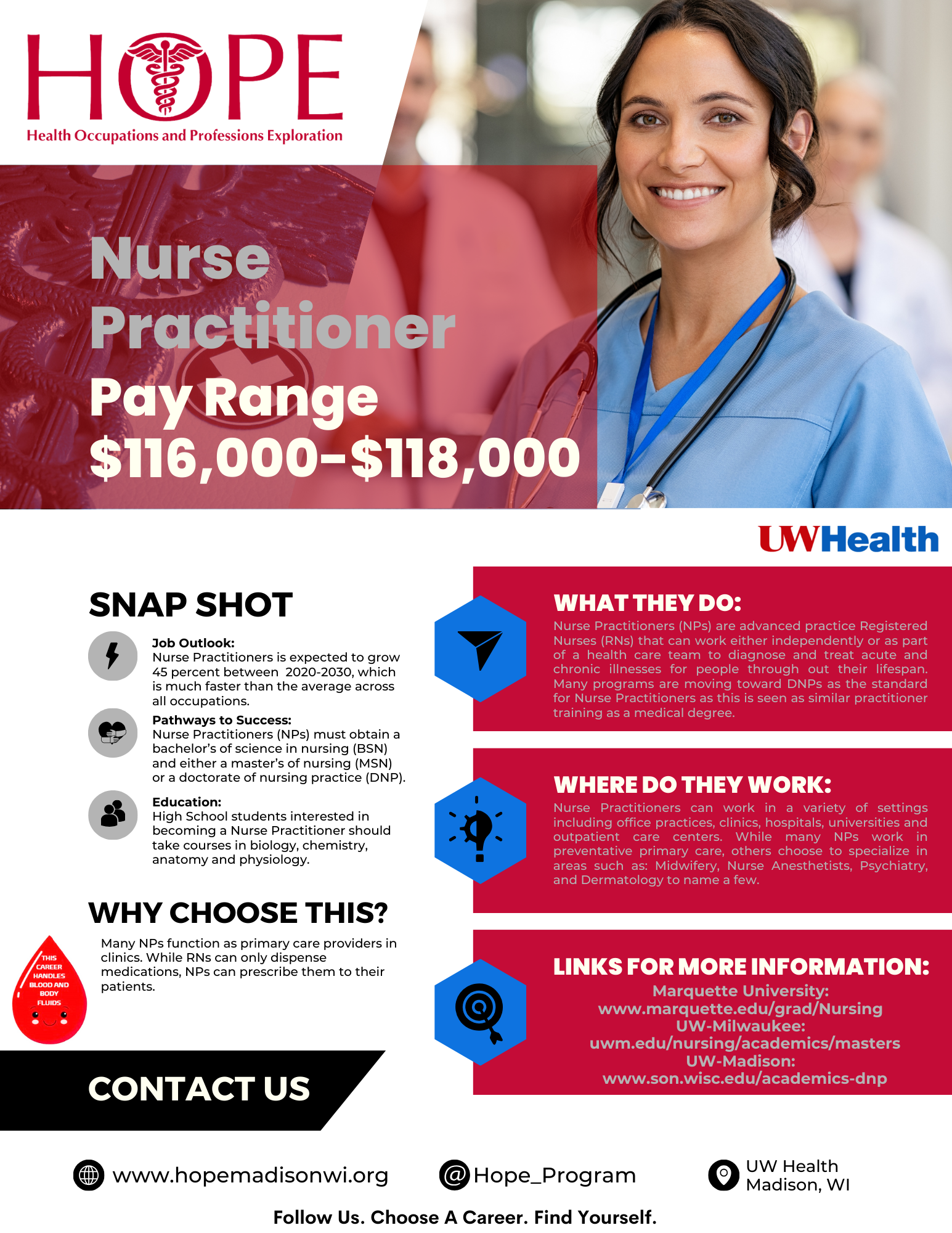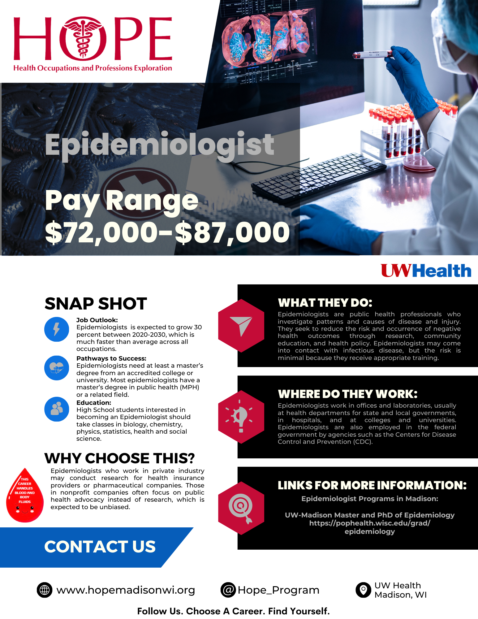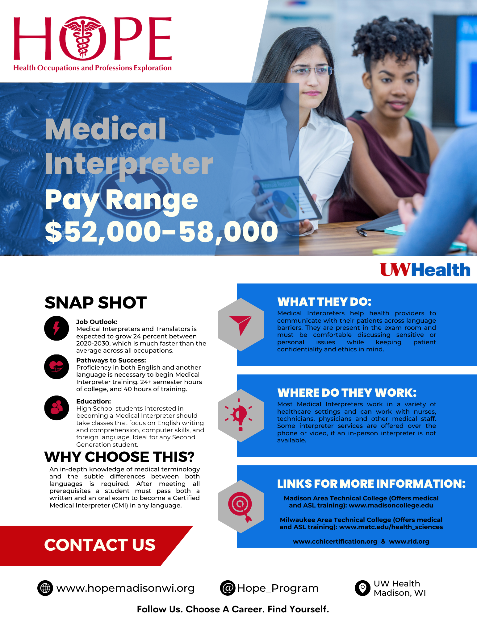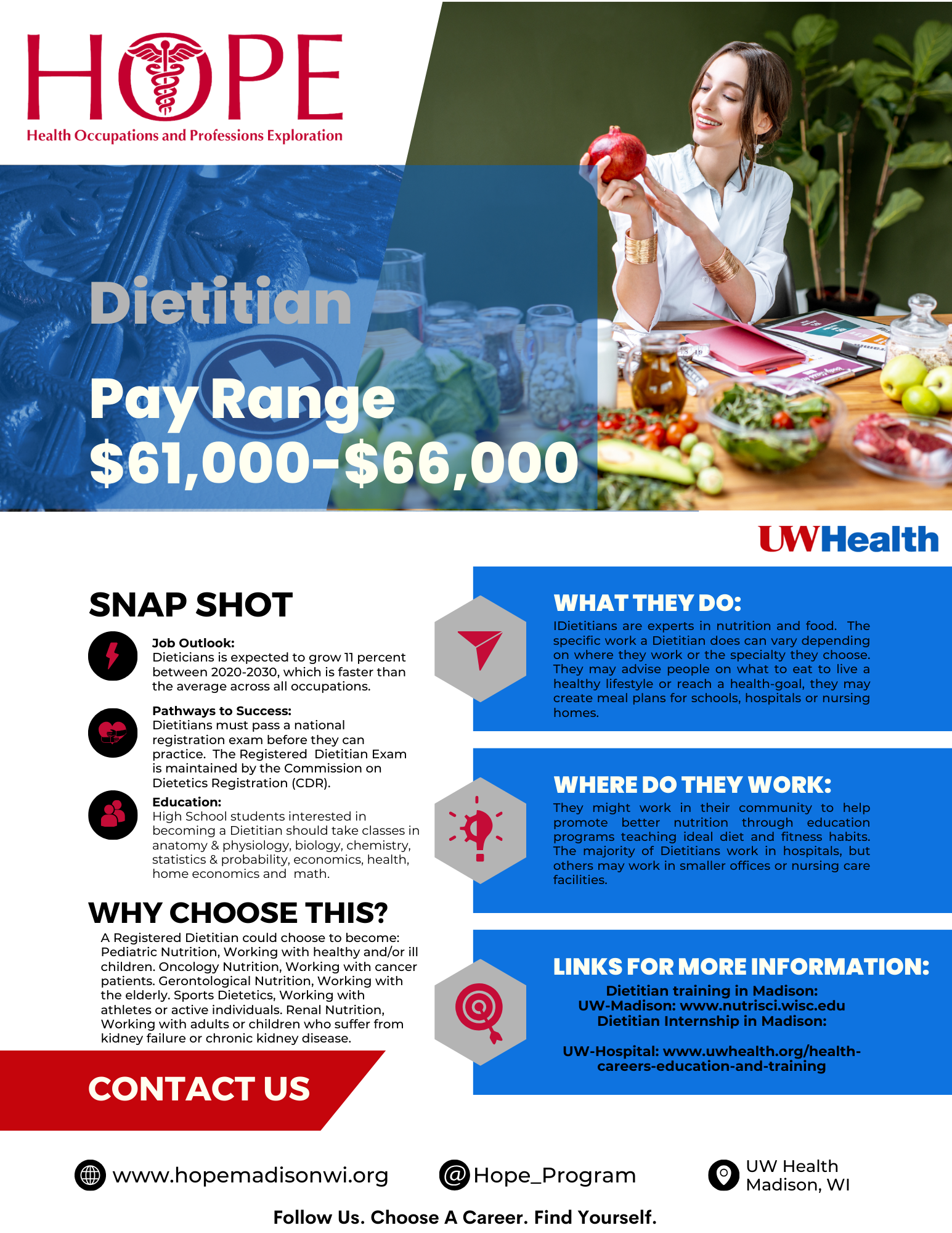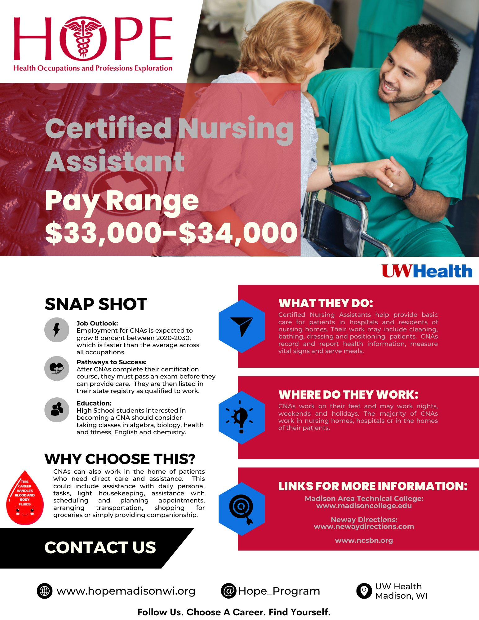 Click and Explore each bubble to explore specific pathways and click the career titles to bring up the over 70 different career “snapshots” in healthcare. This career explorer includes tons of useful information including career descriptions, education requirements, employment outlook percentages, and more!