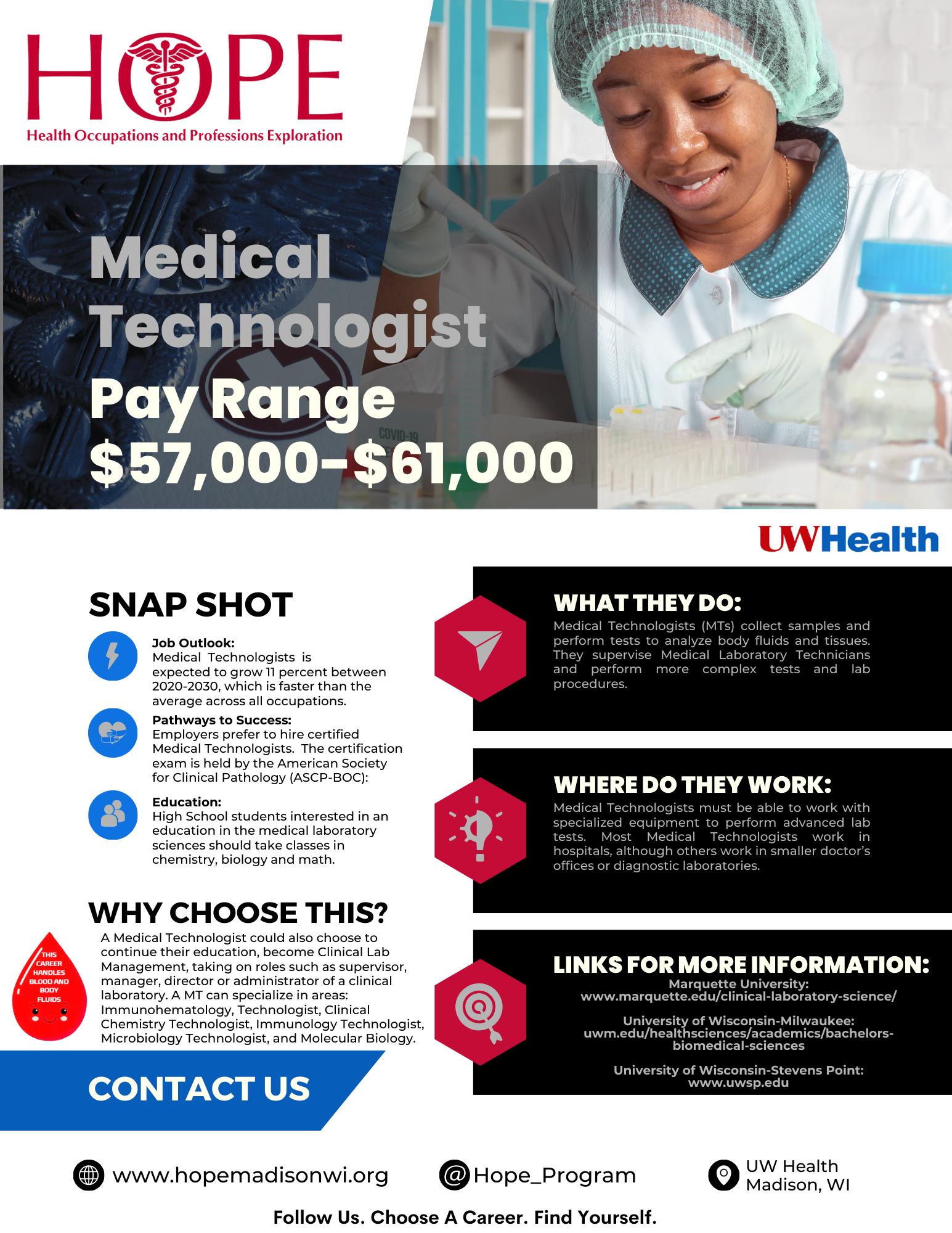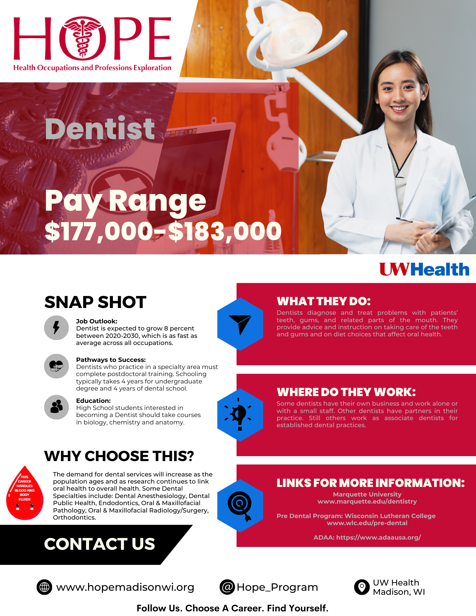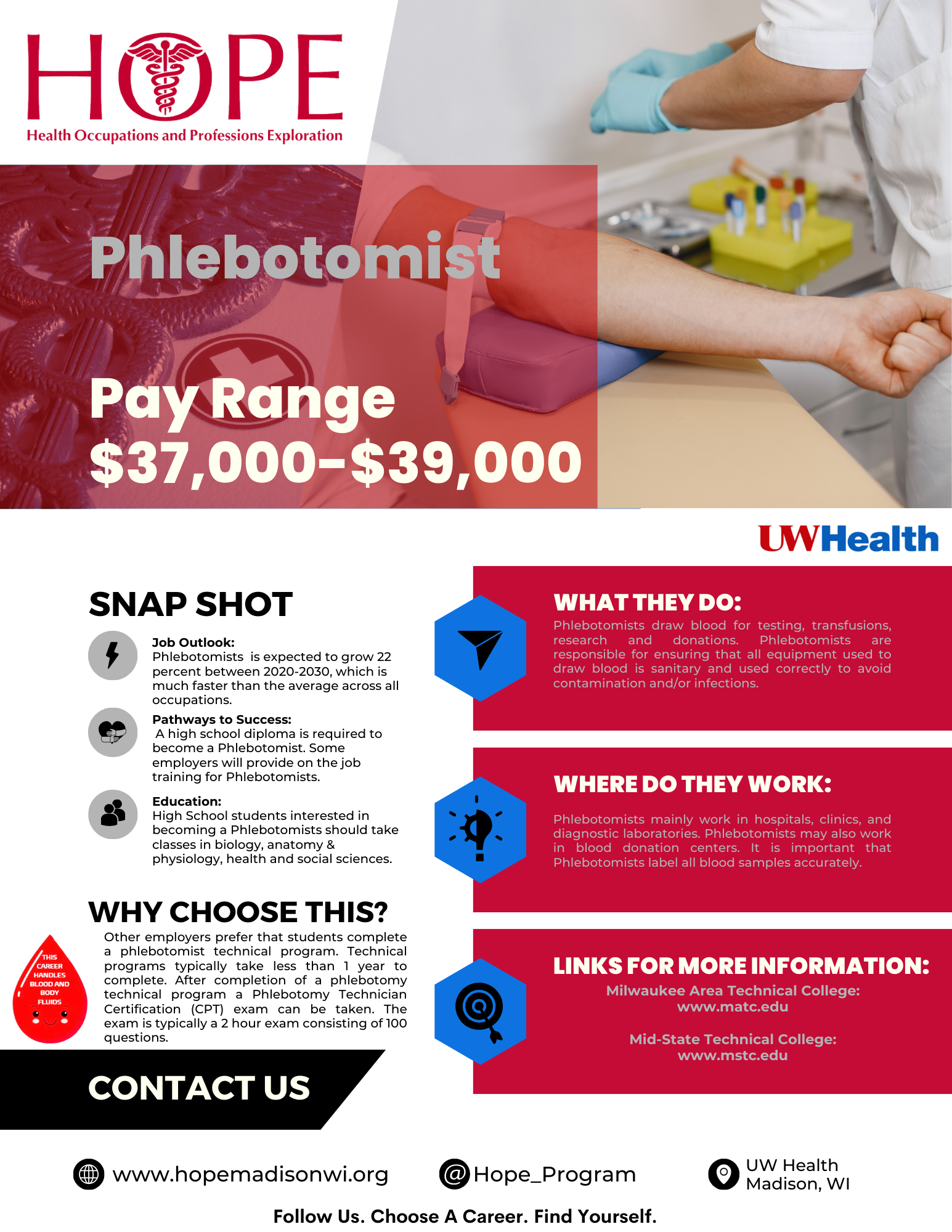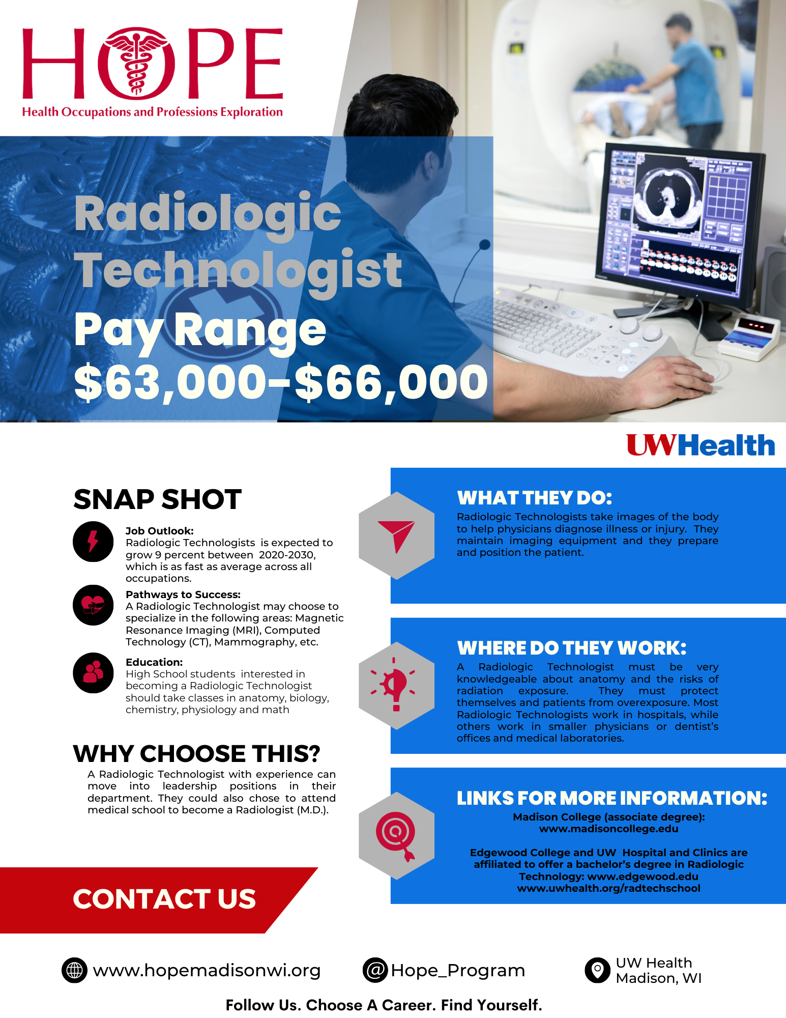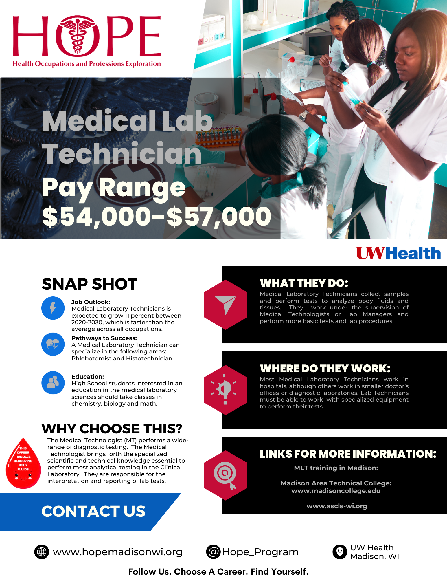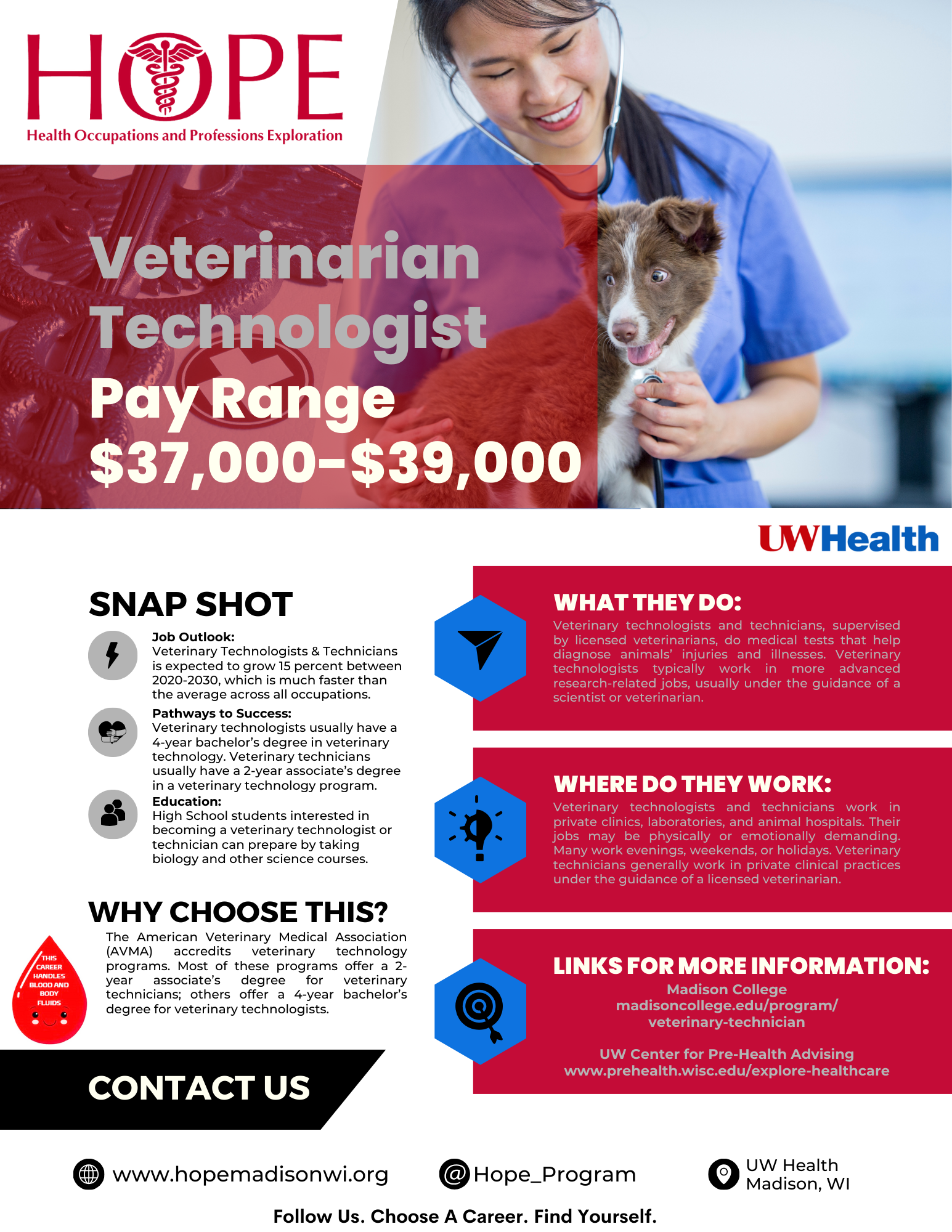 Click and Explore each bubble to explore specific pathways and click the career titles to bring up the over 70 different career “snapshots” in healthcare. This career explorer includes tons of useful information including career descriptions, education requirements, employment outlook percentages, and more!