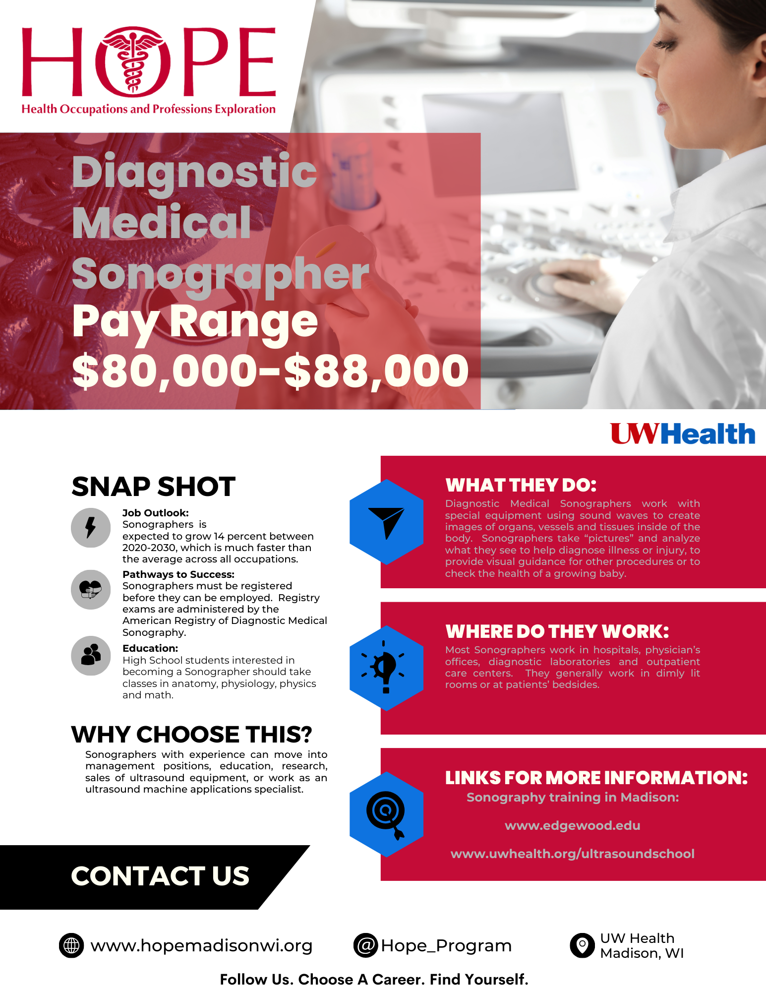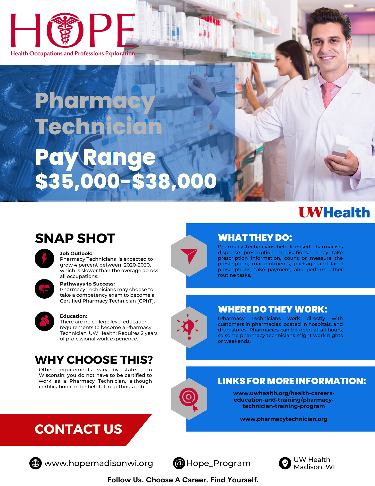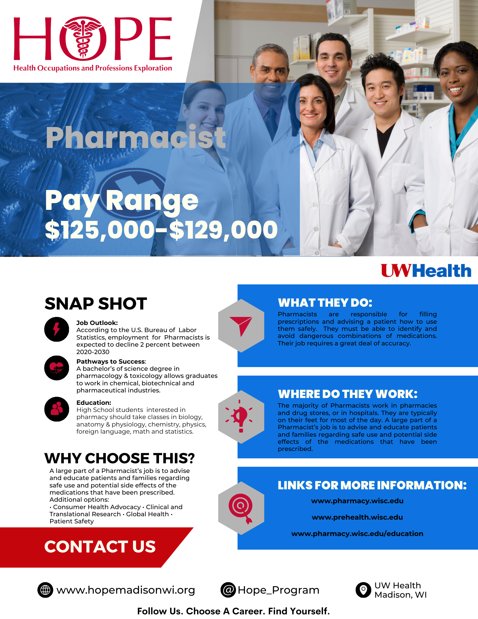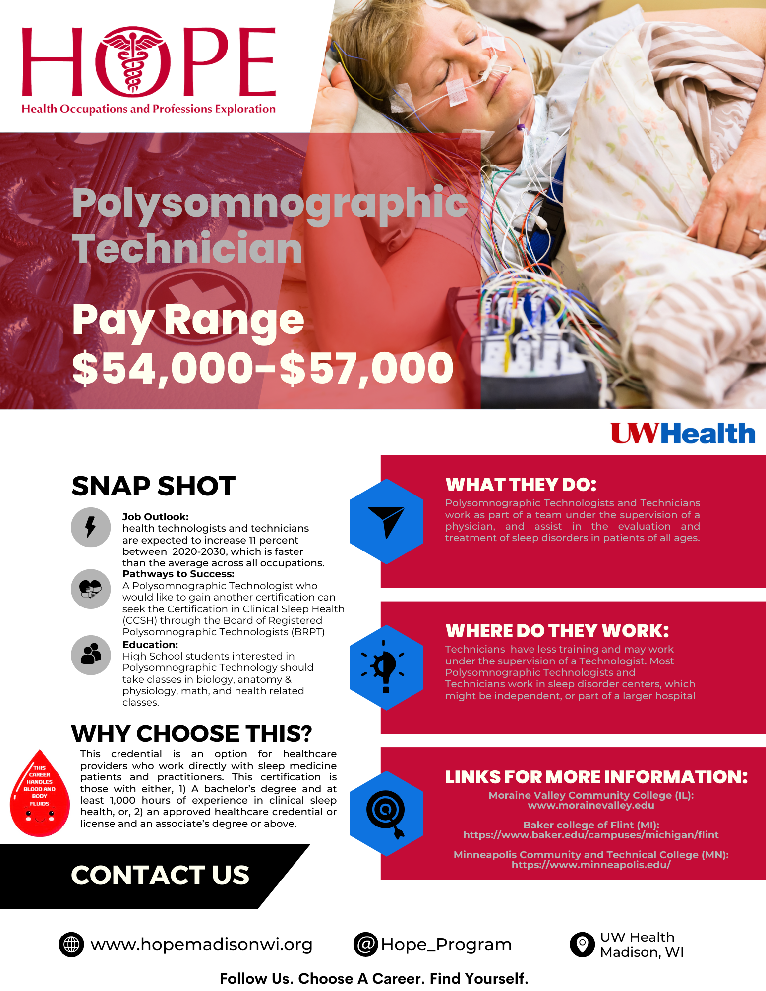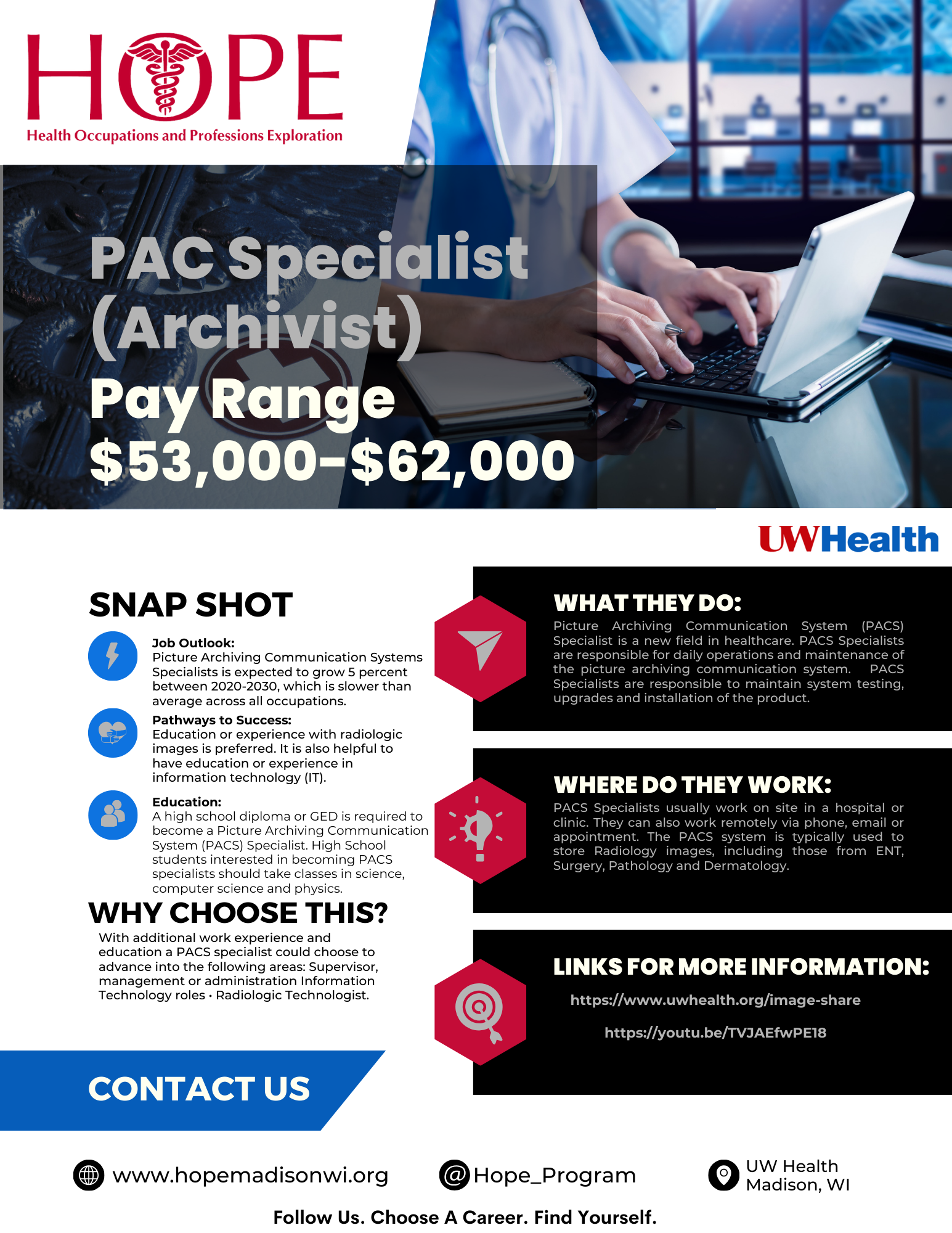 Click and Explore each bubble to explore specific pathways and click the career titles to bring up the over 70 different career “snapshots” in healthcare. This career explorer includes tons of useful information including career descriptions, education requirements, employment outlook percentages, and more!