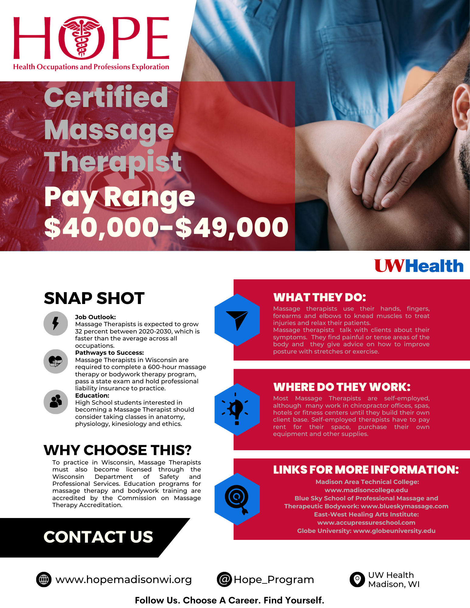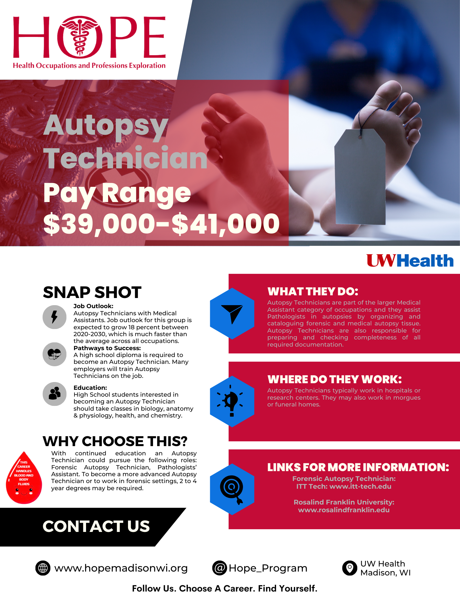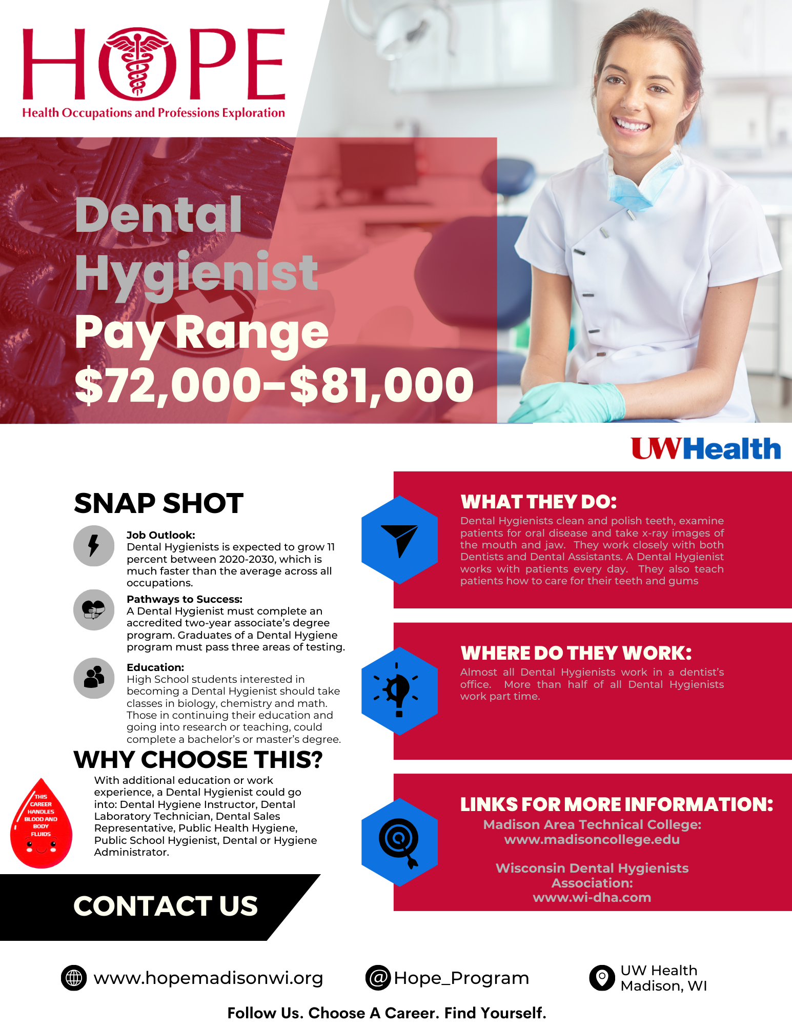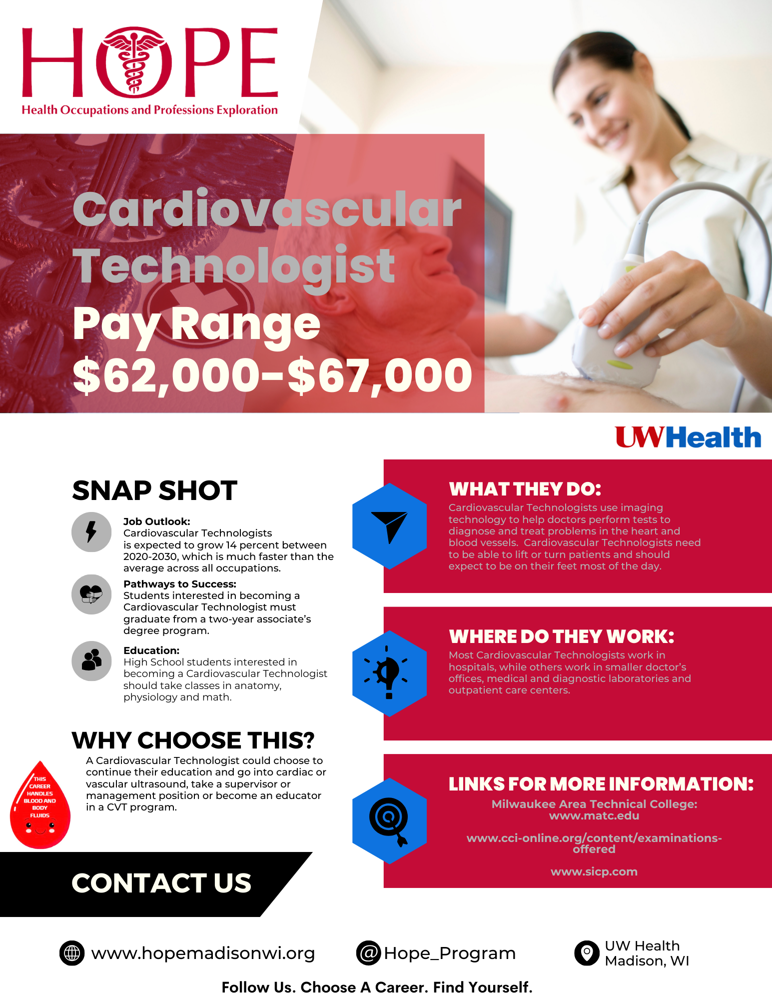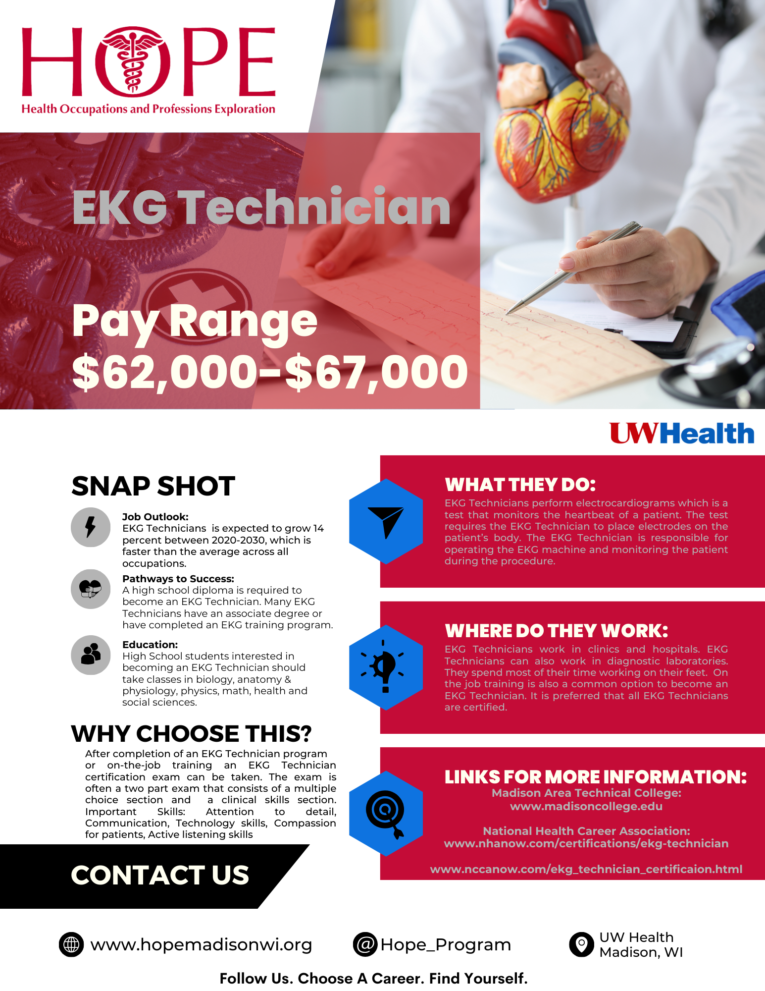 Click and Explore each bubble to explore specific pathways and click the career titles to bring up the over 70 different career “snapshots” in healthcare. This career explorer includes tons of useful information including career descriptions, education requirements, employment outlook percentages, and more!