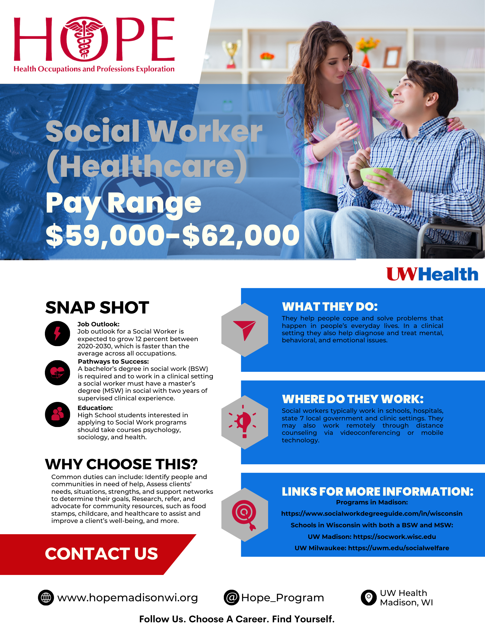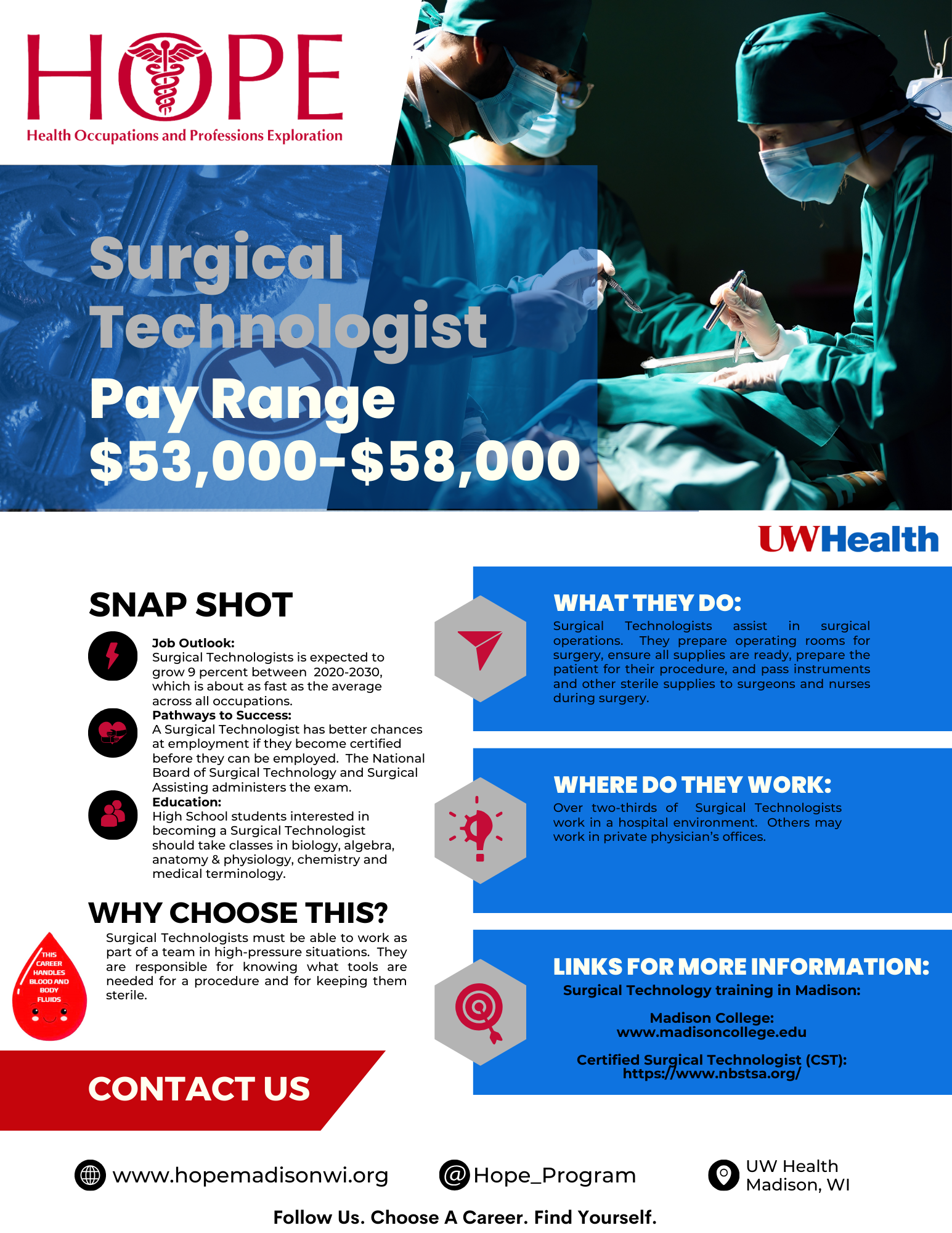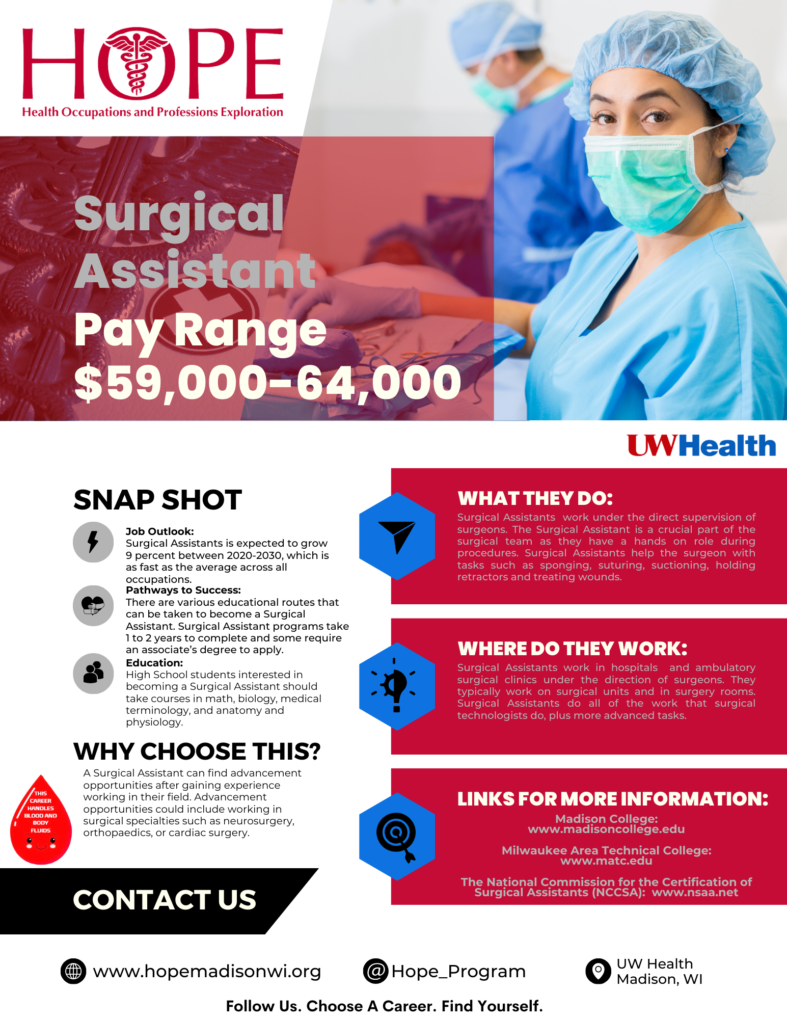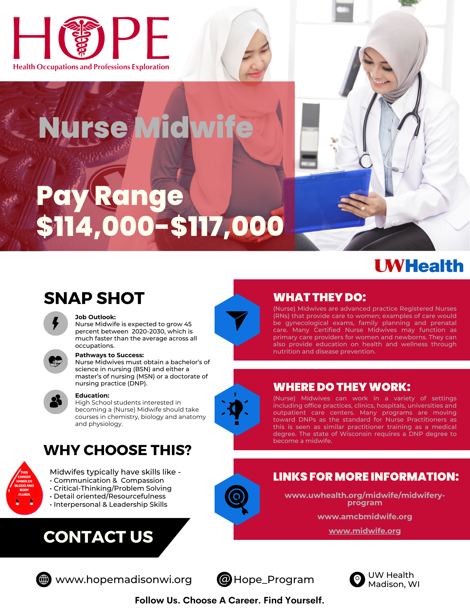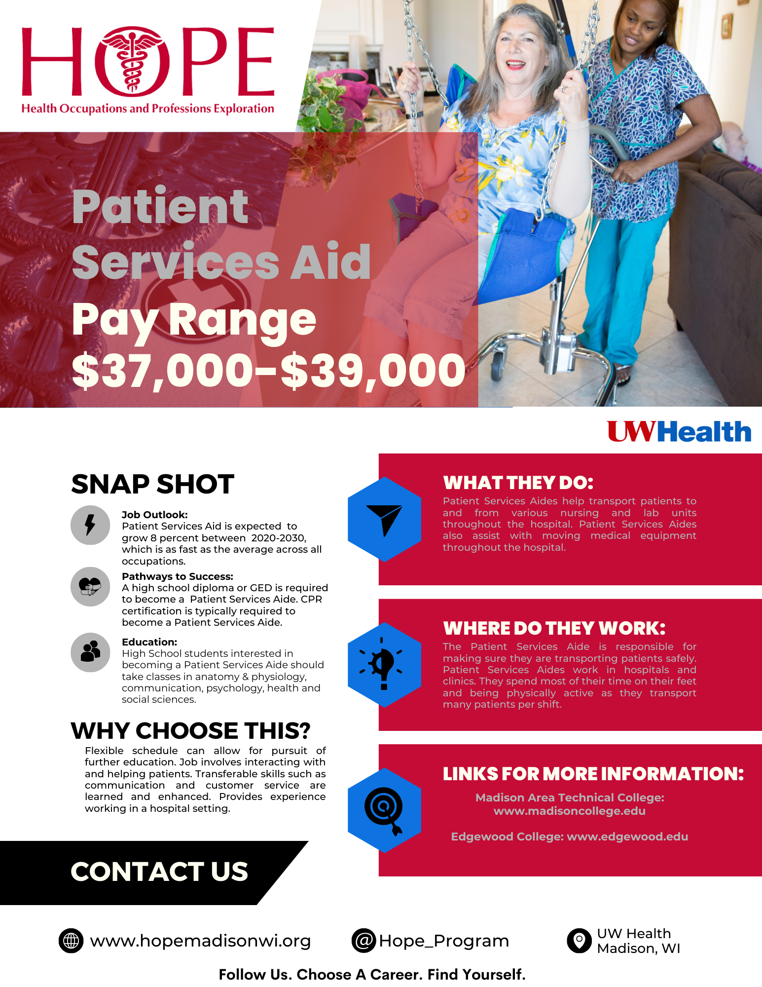 Click and Explore each bubble to explore specific pathways and click the career titles to bring up the over 70 different career “snapshots” in healthcare. This career explorer includes tons of useful information including career descriptions, education requirements, employment outlook percentages, and more!