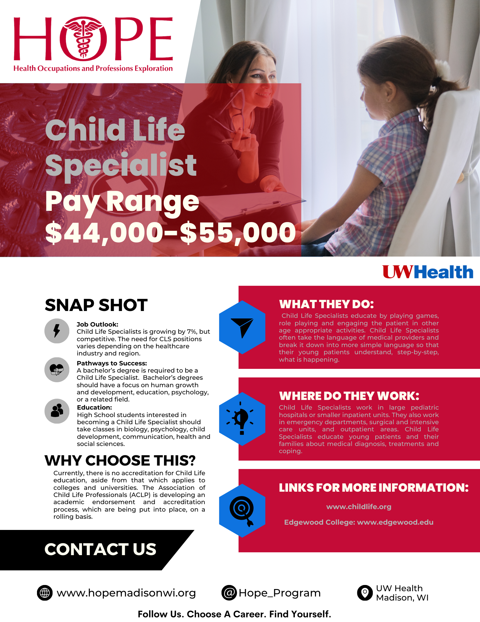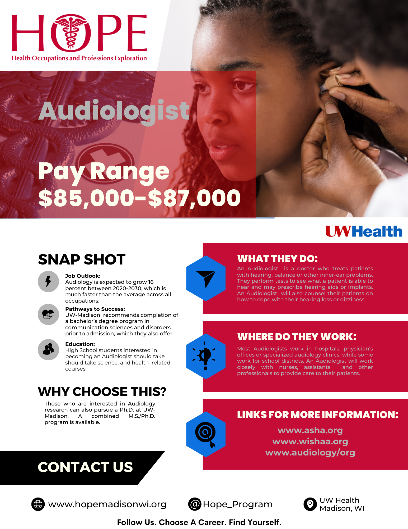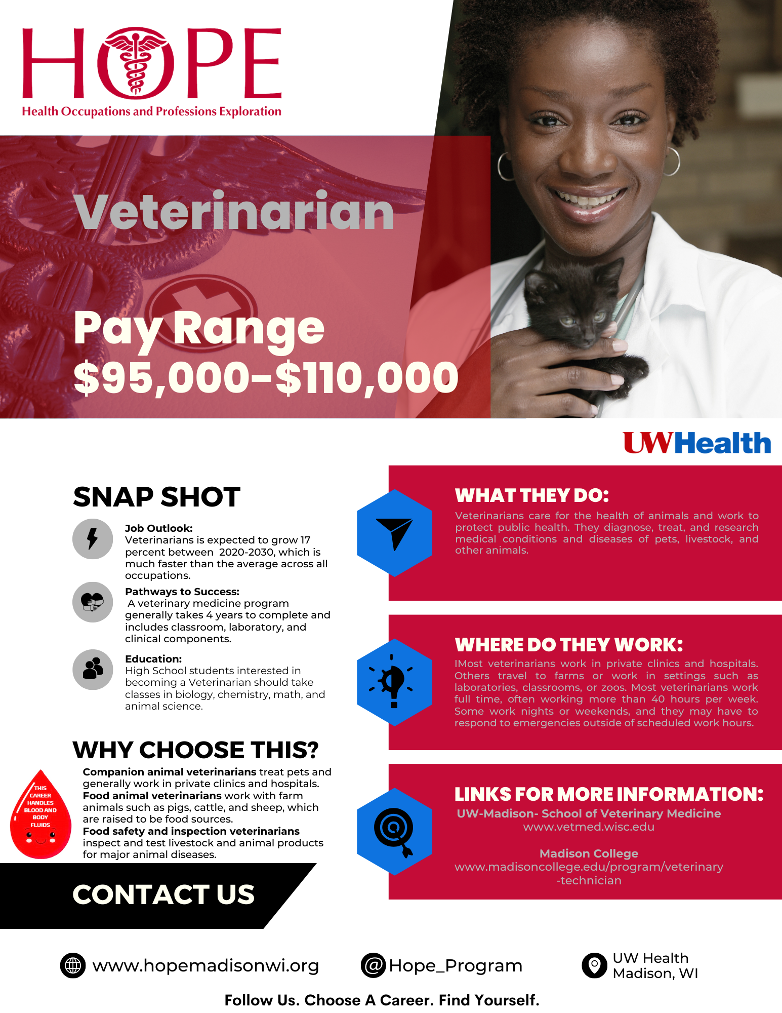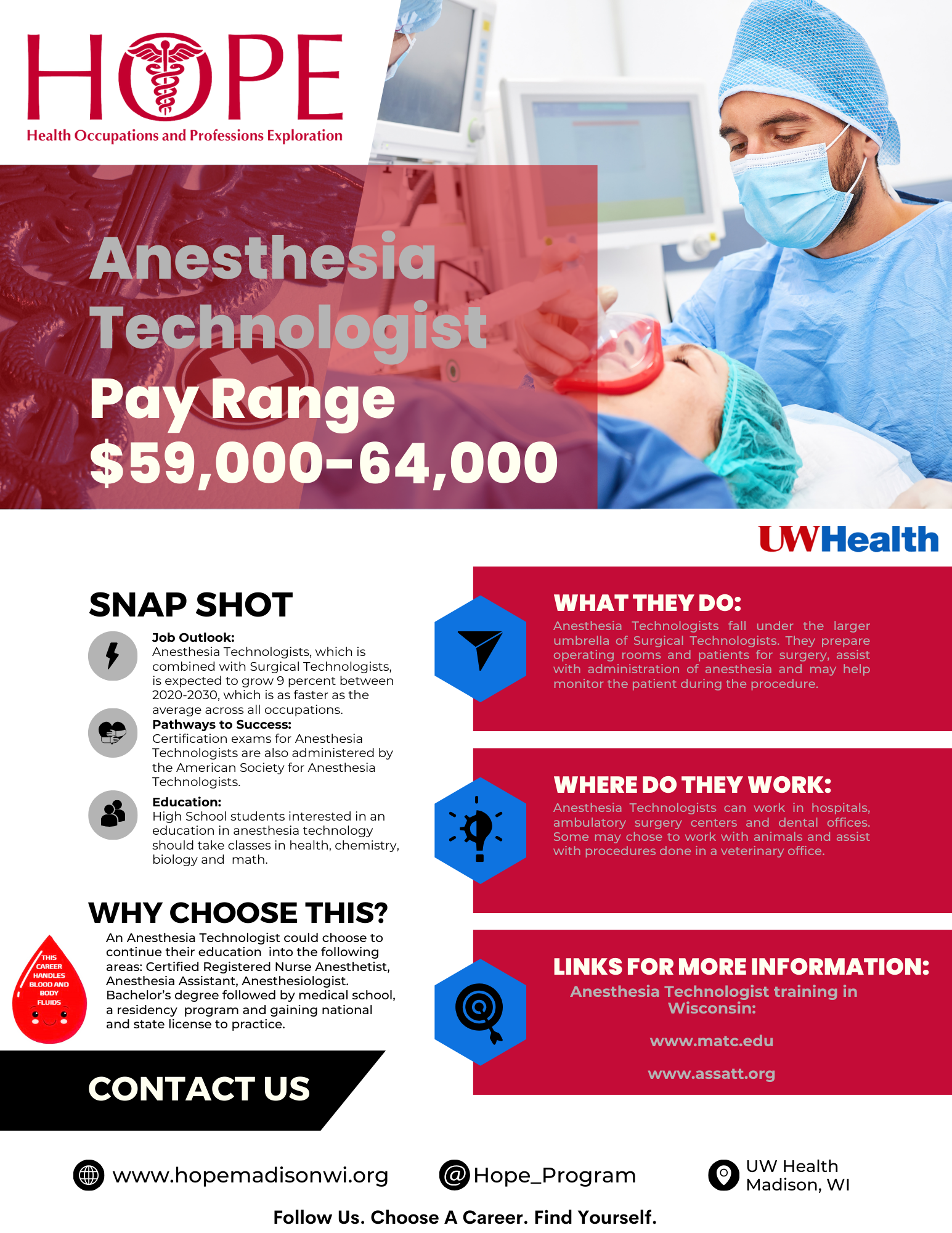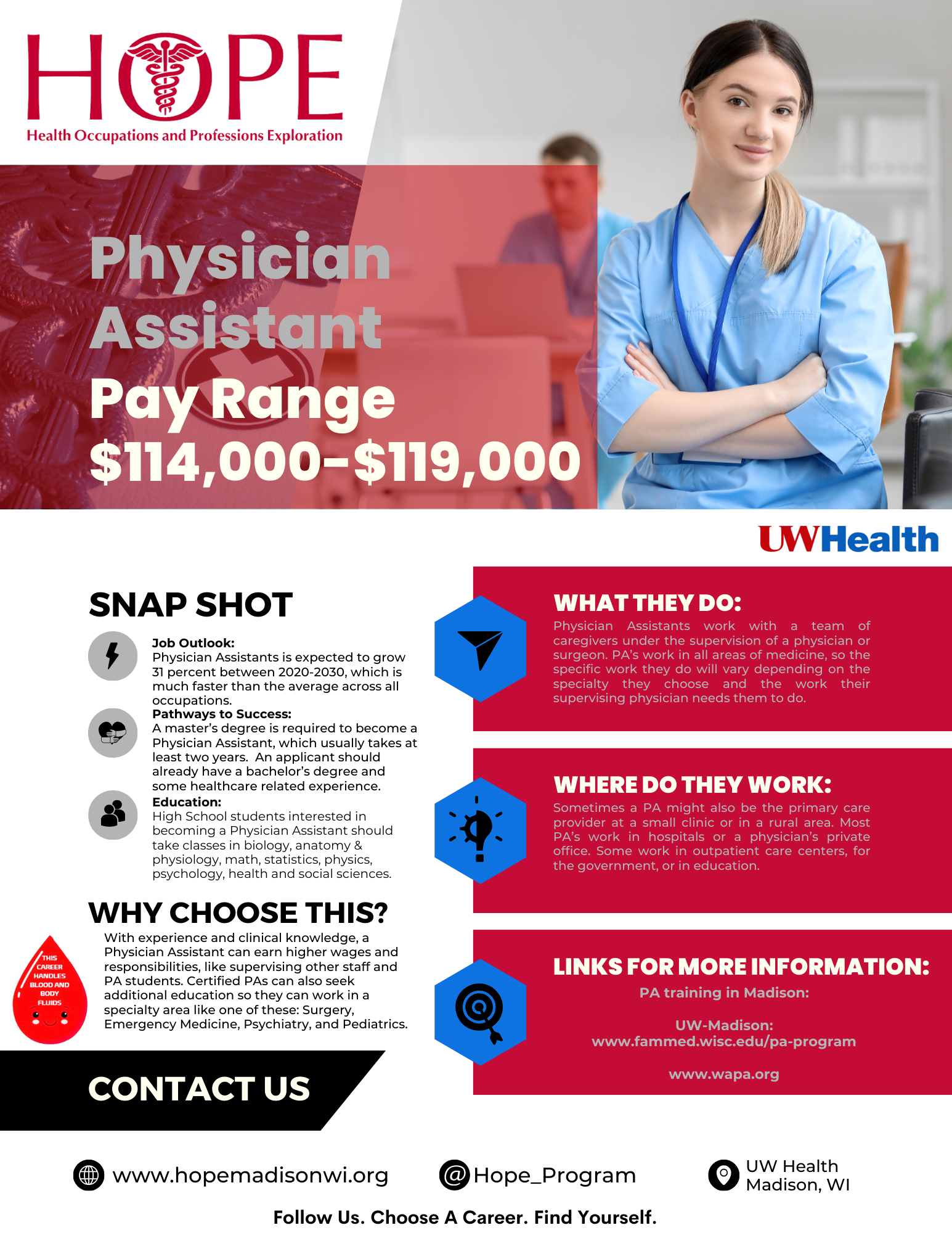Click and Explore each bubble to explore specific pathways and click the career titles to bring up the over 70 different career “snapshots” in healthcare. This career explorer includes tons of useful information including career descriptions, education requirements, employment outlook percentages, and more!