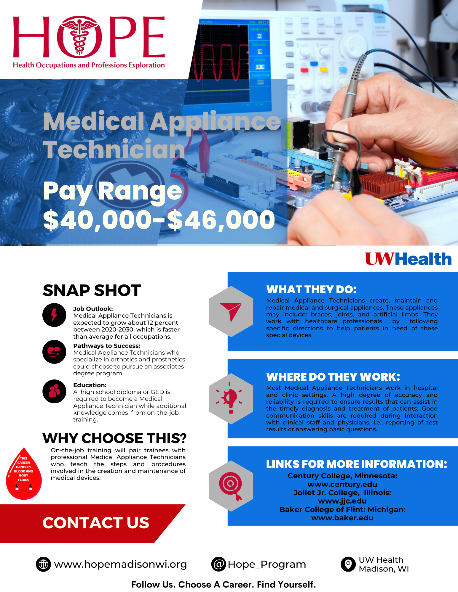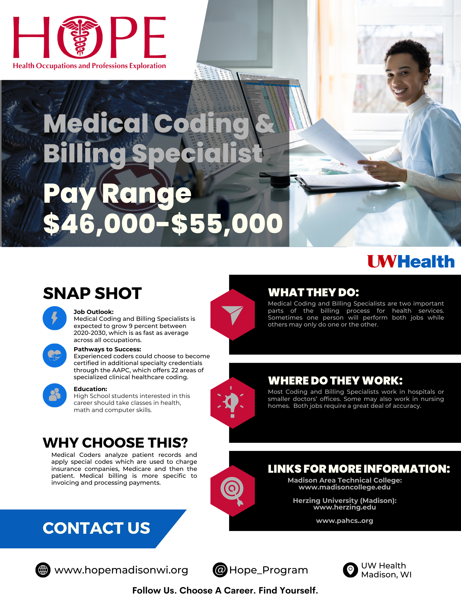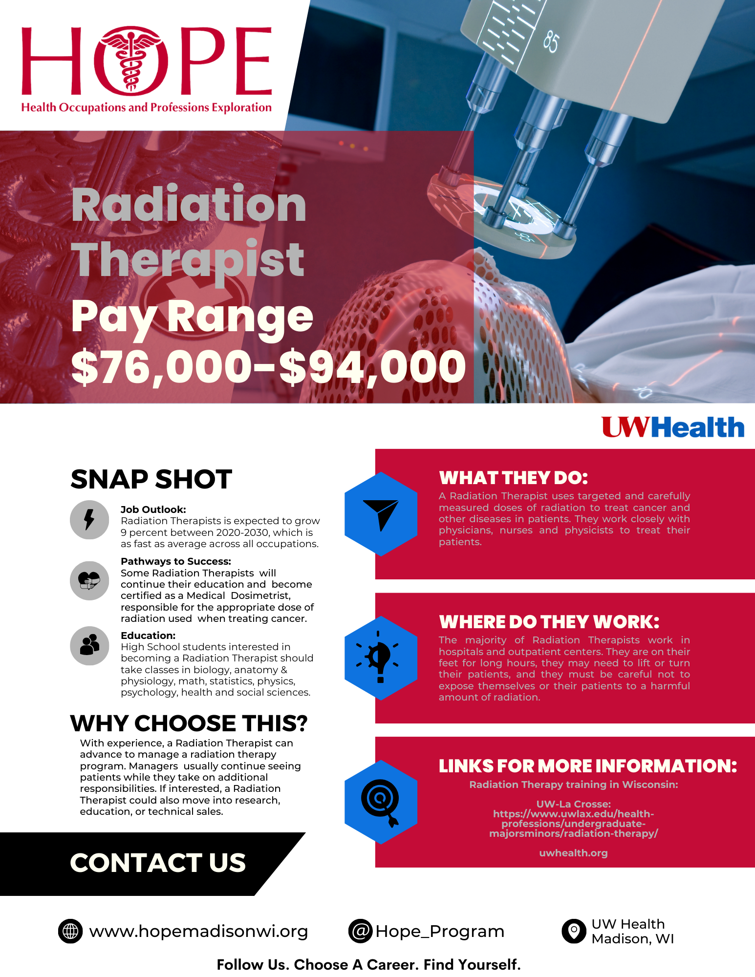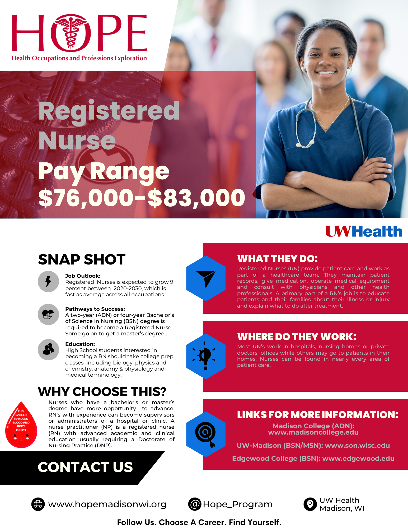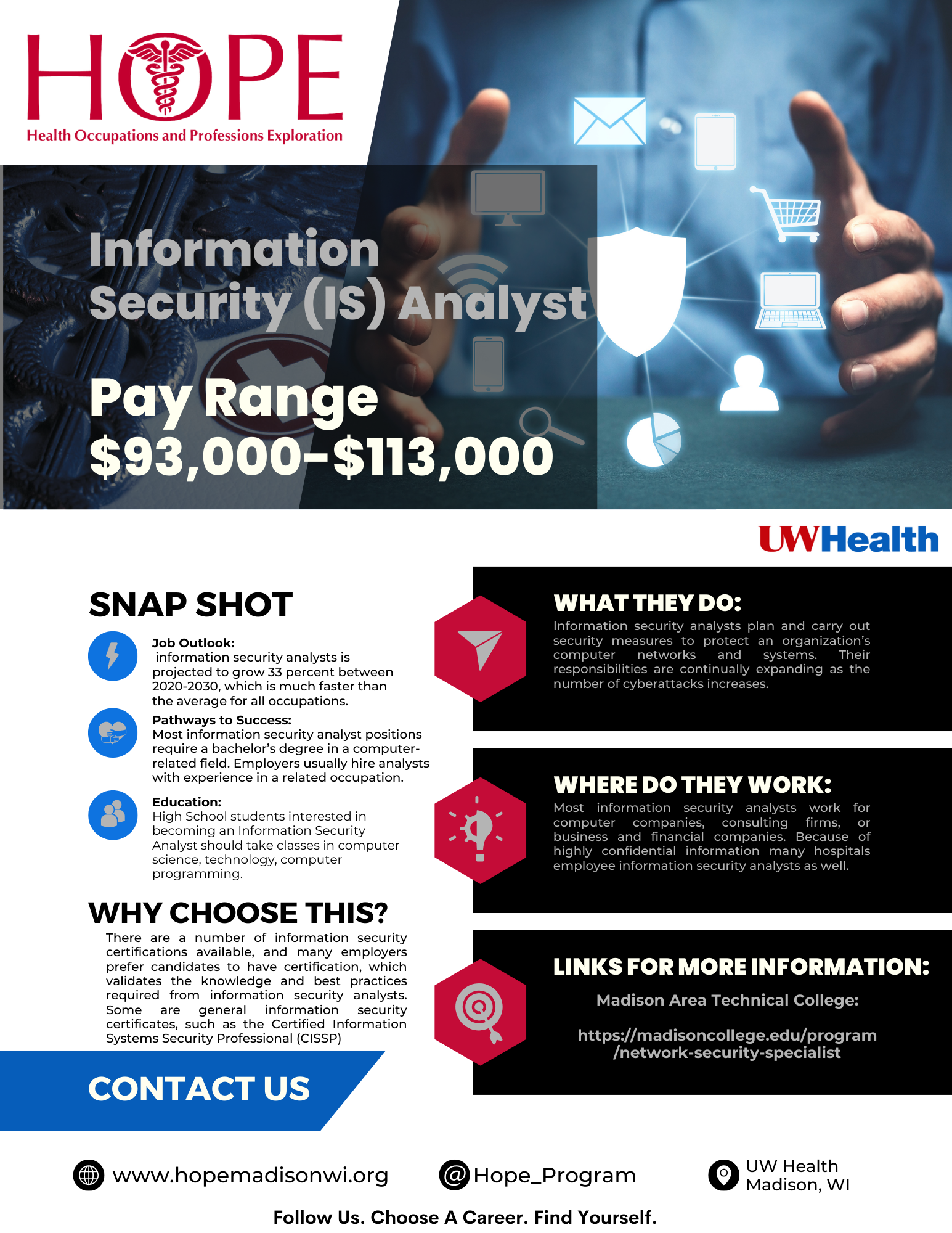 Click and Explore each bubble to explore specific pathways and click the career titles to bring up the over 70 different career “snapshots” in healthcare. This career explorer includes tons of useful information including career descriptions, education requirements, employment outlook percentages, and more!
