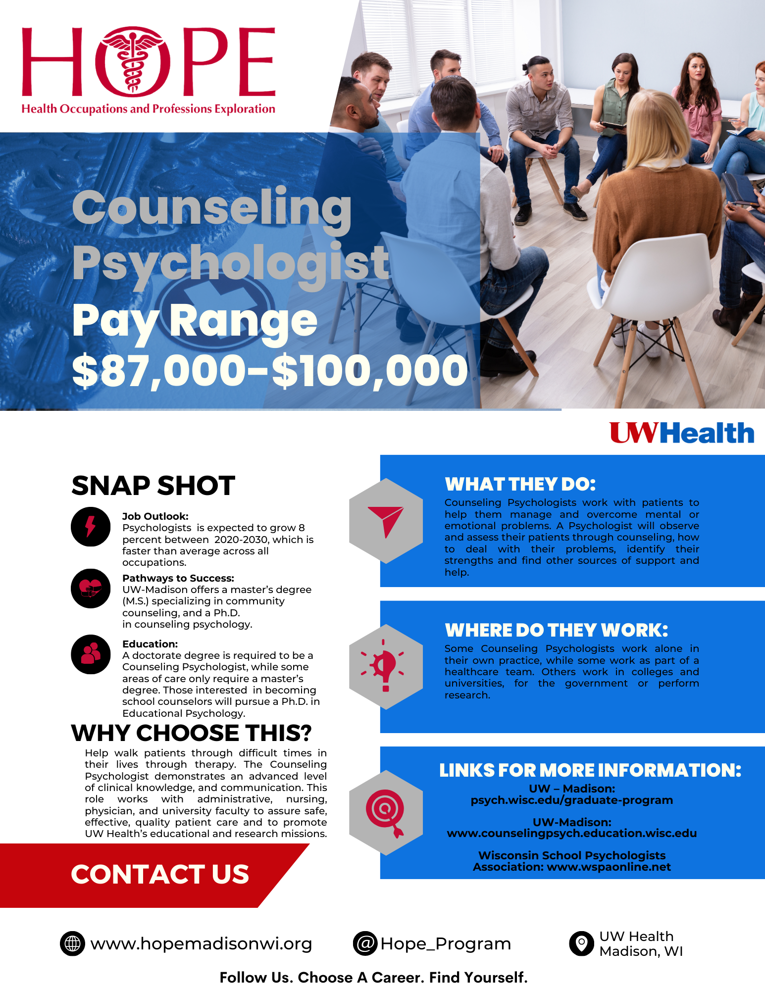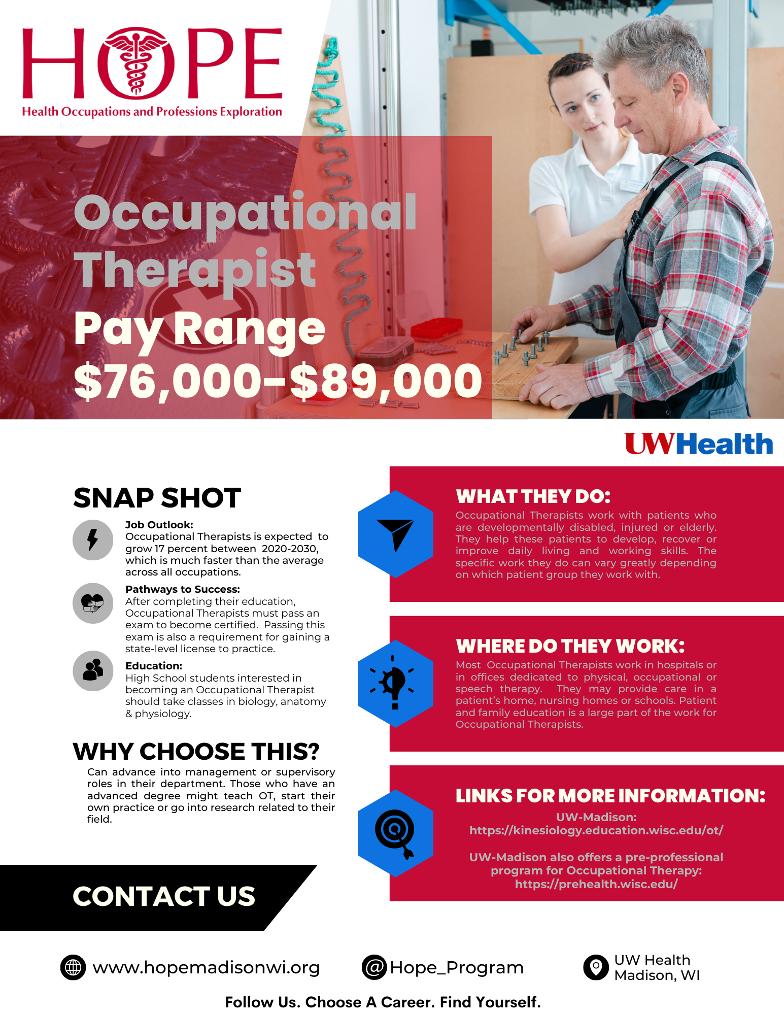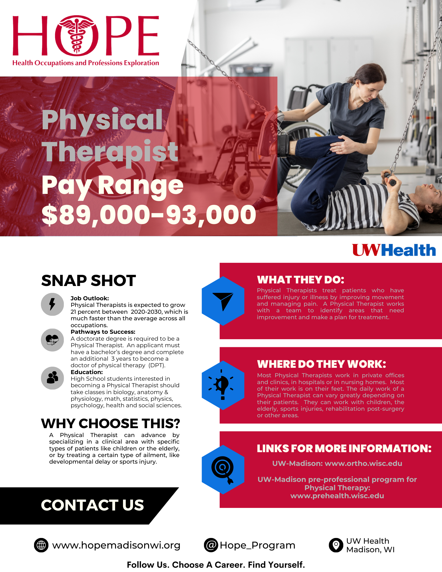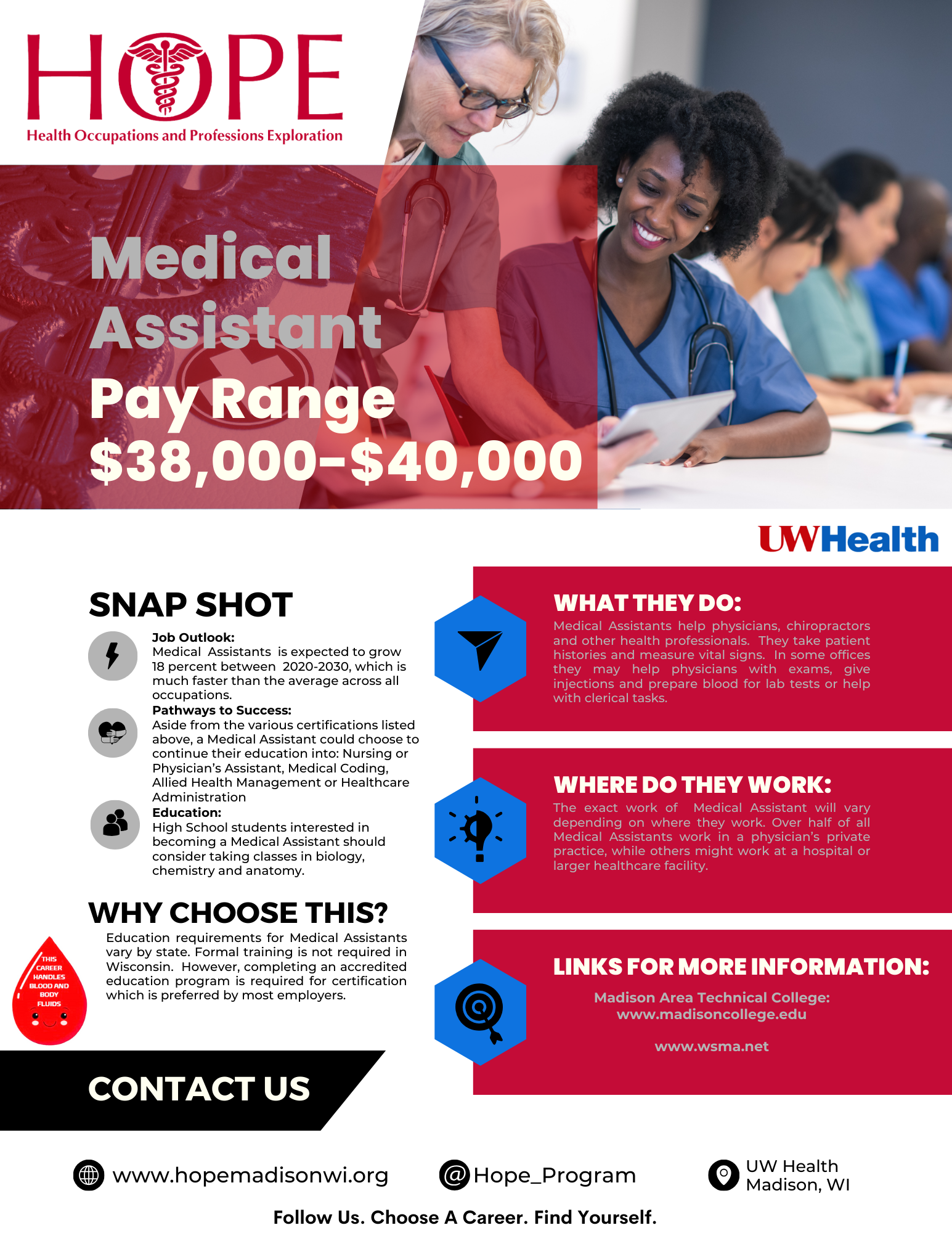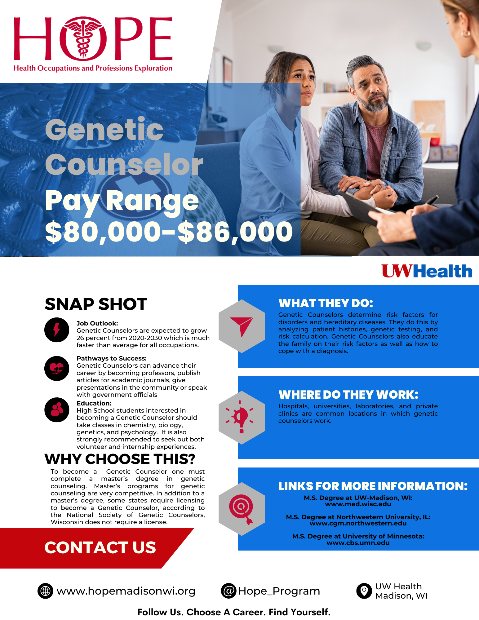 Click and Explore each bubble to explore specific pathways and click the career titles to bring up the over 70 different career “snapshots” in healthcare. This career explorer includes tons of useful information including career descriptions, education requirements, employment outlook percentages, and more!
